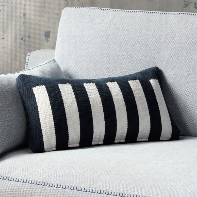 Bands of blue and white converge in a bold asymmetrical pattern by designer Ross Cassidy. Flips to solid navy. Do the math: CB2 low prices include a pillow insert in your choice of plush feather-down or lofty down-alternative (a rare thing indeed).