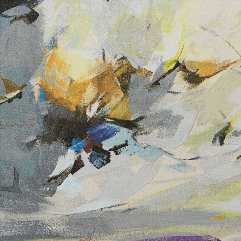 Jeffrey Fitzgerald's artwork represents his life and time spent near the water's edge in his home state of Maine. His art celebrates the turmoil of the ebb and flow of life and the attempts to capture it on canvas. "After Mid Morning" begins with an abstract mix of muted yellows, bluish-greys and a pop of magenta. Closer inspection reveals images that begin to surface, and landscapes come together. "My work is gathering up, building, illustrating, conjuring and refuting. Though I have a passion for rocks, sea and sky, the subject is agile and developing," the artist explains. CB2 exclusive.