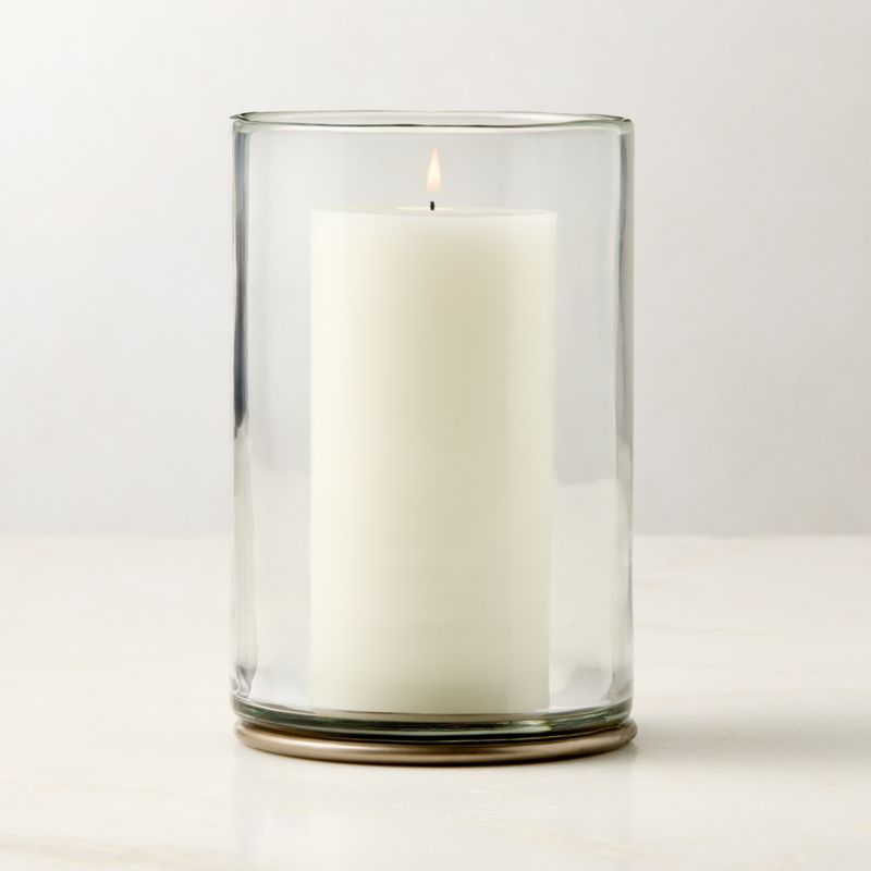 Outdoor lantern by Kara Mann brings architecture and warmth into easy balance. A flash of white bronze-plated brass grounds the base and catches a candle's glow to cast a gentle shimmer. Thick, clear soda lime glass rises with a soft hot-cut rim that adds a subtle, hand-finished note to its clean silhouette. CB2 exclusive.
