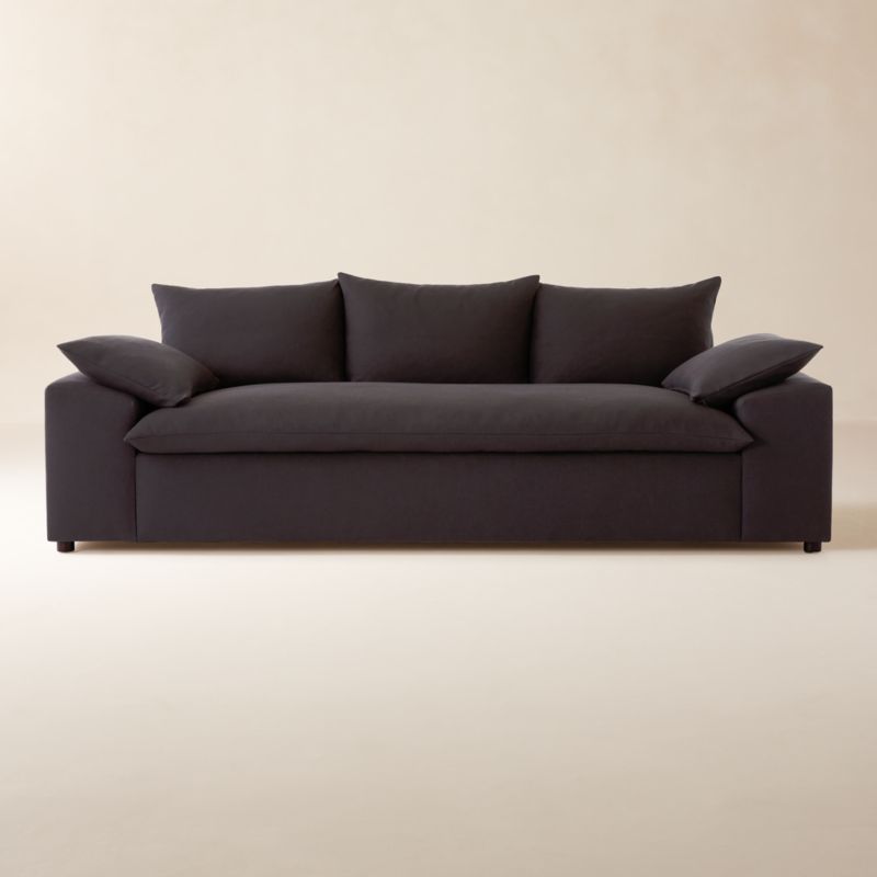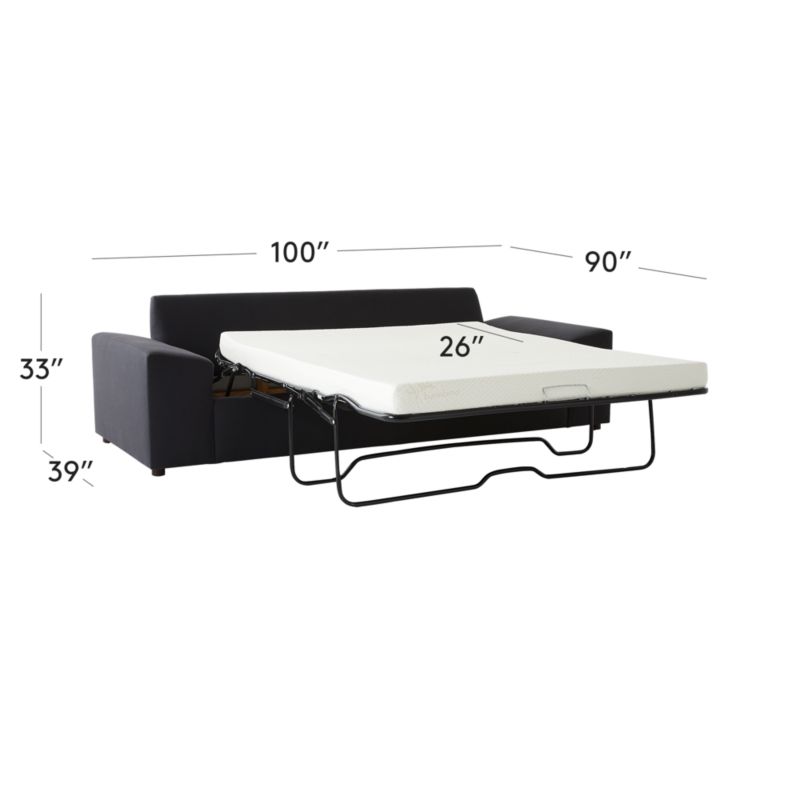 Designed by VUUE, sleeper sofa offers elevated comfort in a relaxed performance linen. The deep, loungy profile is contrasted by two angled arms that, when paired with the pillow-like cushions, make a perfect spot for an impromptu nap. Featuring a memory foam mattress, the sofa effortlessly stretches out to a queen bed for overnight guests. CB2 exclusive.