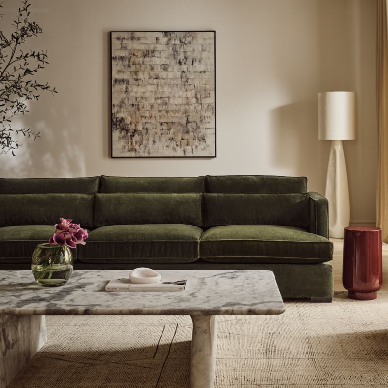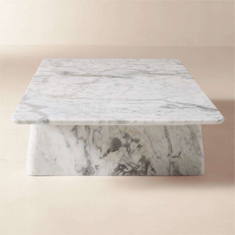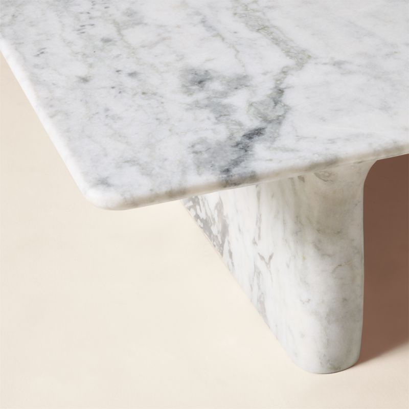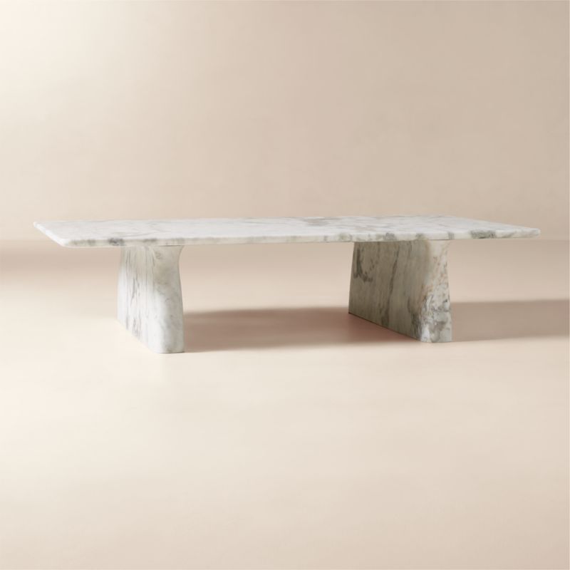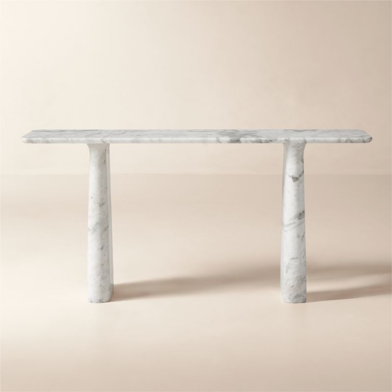 Honed Statuario marble console table from Brooklyn-based Caleb Zipperer anchors the room with rich, expressive veining and delicate curves. Grounded by two bold legs, the top is thin and expansive, highlighting the subtle earthy tonal variations in the marble that make each piece naturally one of a kind. CB2 exclusive.