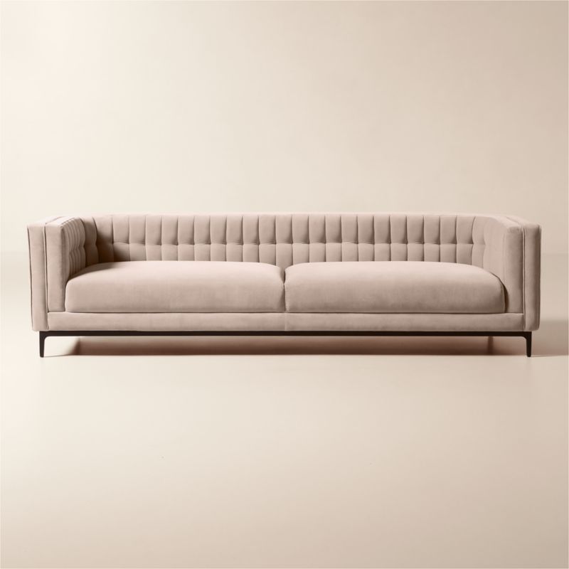 Mermelada Estudio. Classic details such as blind tufting and welting complement the modern silhouette while highlighting the high level of craftsmanship throughout. Sofa is upholstered in light taupe-toned velvet designed to meet the needs of everyday living. The frame, hand-assembled of kiln-dried hardwood certified sustainable by the Forest Stewardship Council ® (FSC), is topped by thick cushions that provide deep comfort and plush support. CB2 exclusive.