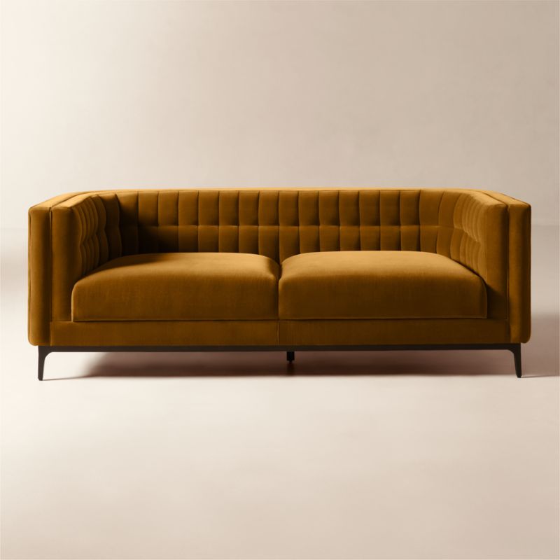 Subtle curves and a channel-tufted back define the architecture of this long, sleek sofa by Mermelada Estudio. Classic details such as blind tufting and welting complement the modern silhouette while highlighting the high level of craftsmanship throughout. Sofa is upholstered in amber-toned velvet designed to meet the needs of everyday living. The frame, hand-assembled of kiln-dried hardwood certified sustainable by the Forest Stewardship Council ® (FSC), is topped by thick cushions that provide deep comfort and plush support. CB2 exclusive.