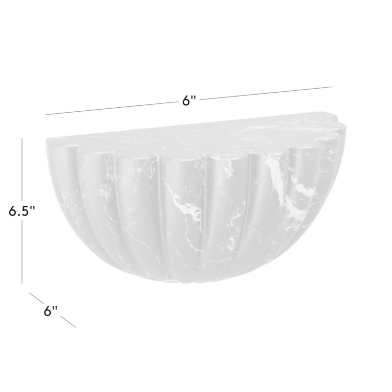 Fluted shelf by Ceci Thompson of VUUE earns its dark allure from a slab of black marble. Carved into a scalloped shape, its rippled silhouette supports a top shelf for displaying small treasures. CB2 exclusive.