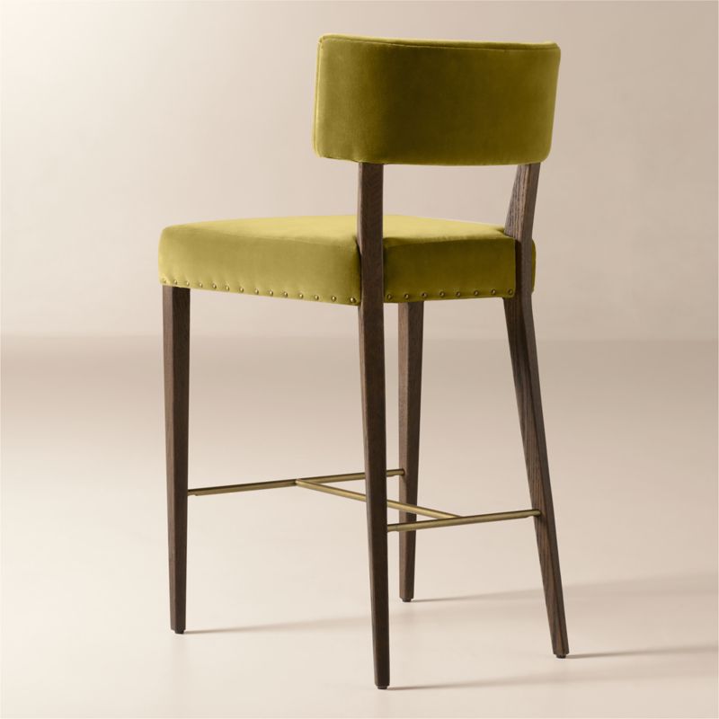 Tailored velvet dining armchair by NYC-based designer Brett Beldock invites you to linger. FSC ®-certified solid oak shapes the chair's clean lines and gently curved back, complemented by rich olive green velvet. Thoughtful details include warm aged bronze nailheads that outline the seat cushion in a nod to vintage upholstery. CB2 exclusive.