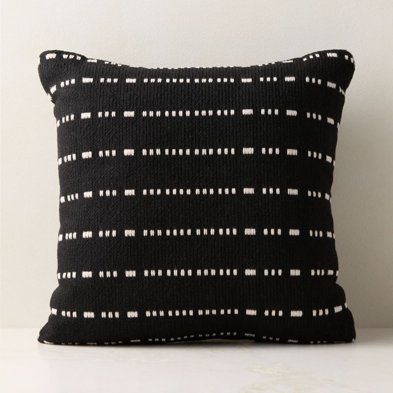 Outdoor throw pillow brings graphic stripes to open-air seating. Rows of stitches create a tailored, rhythmic pattern, while a sewn-shut knife-edge finish sharpens the silhouette. Woven from 100% recycled polyester on both front and back, the fabric offers a softer feel while standing up to outdoor conditions. CB2 exclusive.
