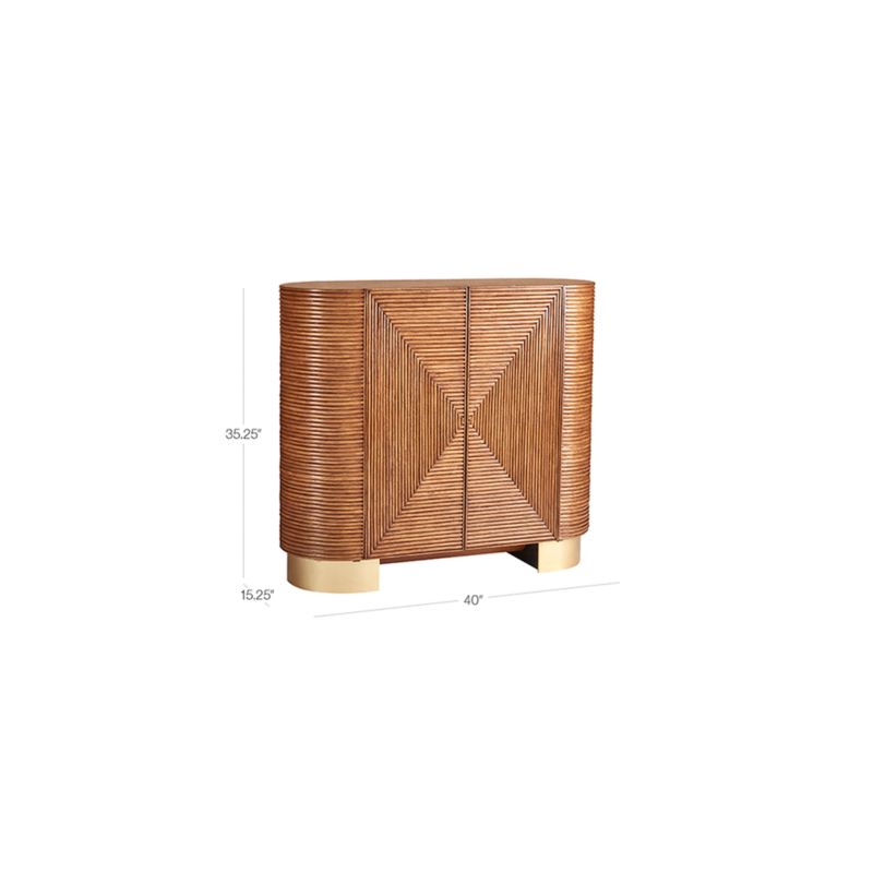 Brett Beldock serves a traditional rattan bar cabinet up with a twist. Solid wood frame with rattan core patterned detail stands modern on a brass half moon base. Inside, shelves hold flat bottomed glasses or flip to store wine bottles in divots. CB2 exclusive.