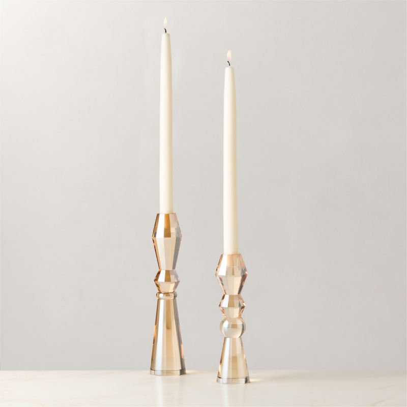 Brett Beldock is a modern heirloom. Finished in champagne, thick-cut K9 crystal catches the flicker of the candlelight for a radiant effect. Pair with the other Aven taper candle holders. CB2 exclusive.