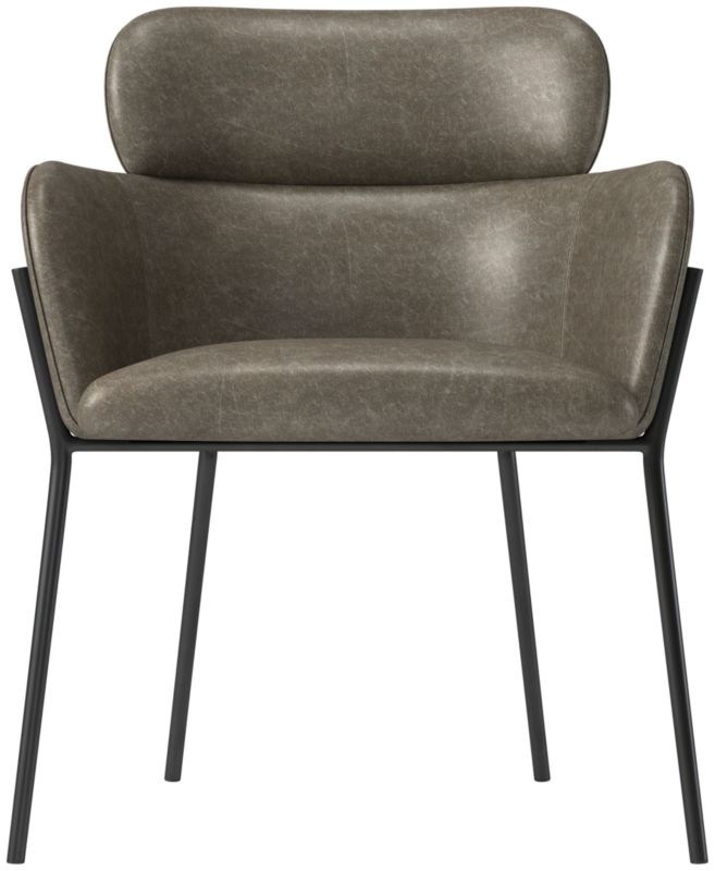 Designed by Caleb Zipperer and curved with two tiers of comfort, black leather dining chair invites guests to stay a while. Clad in soft black top grain leather that will develop a beautiful patina over time, the chair sits plush with the bottom tier sized just right for arm resting. Slim iron frame is finished in glossy black. CB2 exclusive.