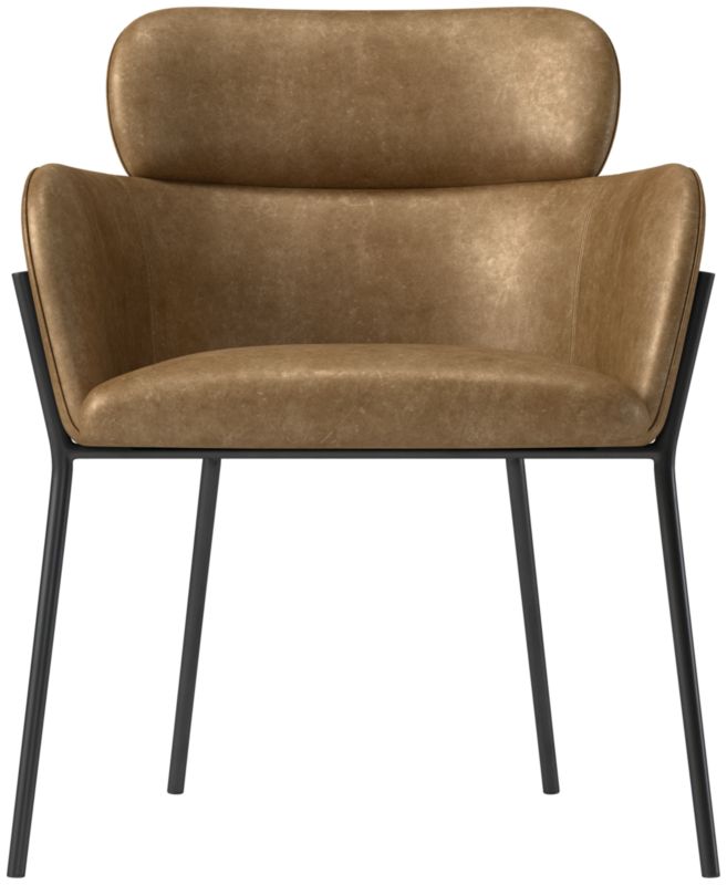 Designed by Caleb Zipperer and curved with two tiers of comfort, black leather dining chair invites guests to stay a while. Clad in soft black top grain leather that will develop a beautiful patina over time, the chair sits plush with the bottom tier sized just right for arm resting. Slim iron frame is finished in glossy black. CB2 exclusive.