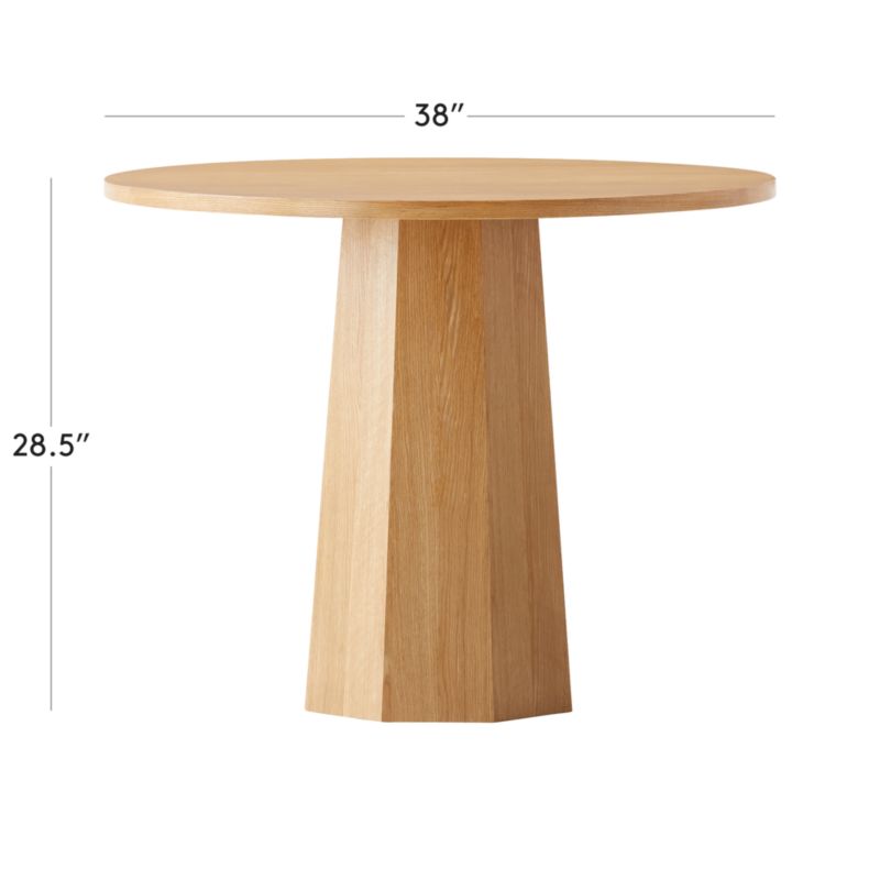 Crafted with solid oak certified sustainable by the Forest Stewardship Council ® (FSC), round wooden table by Jannis Ellenberger brings substance to the dining room. Its simplicity of form and embrace of natural wood is complemented by a faceted base. Seats four comfortably or may be used as the focal point of a grand foyer. CB2 exclusive.