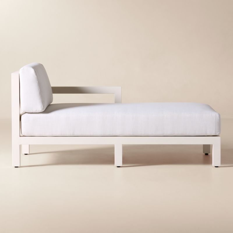 Designed by Barcelona-based Mermelada Estudio, outdoor chaise is modern in form with clean lines and minimalist styling. Constructed from aluminum for durability season after season, the low-slung chaise welcomes summer entertaining in a soft ivory hue with linear framing that emphasizes the architectural frame. Lofty outdoor cushions are covered in a cream performance fabric designed in Denmark with the slubby, flecked look of a high-end linen and comfort of indoor furniture. Float the chair on its own or add coordinating Bay pieces to create a spacious outdoor sectional. CB2 exclusive.