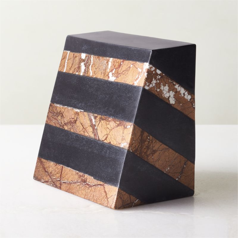 Smooth and modern, layered marble bookend elevates the bookshelf. Jaisalmer yellow marble is stacked with Bhainslana black marble to create a stunning layered effect that draws attention anywhere it rests. CB2 exclusive.