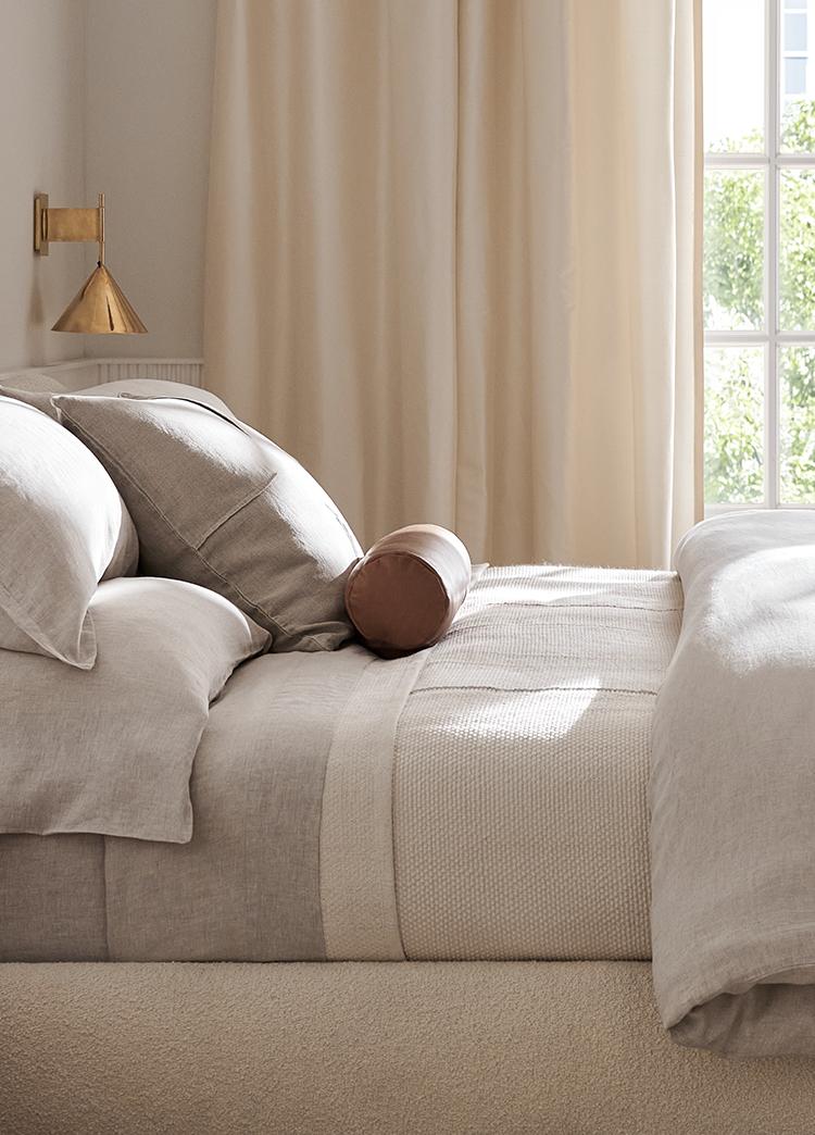 Crafted from the finest European flax, our linen bedding sets offer unmatched breathability and a touch of timeless elegance to your bedroom. Linen is a natural textile fabric made from the fibers of the flax plant (Linum usitatissimum). It has been used for thousands of years to create a wide range of products, including clothing, home textiles, and more. CB2 offers EUROPEAN FLAX™-Certified Linen which is made from flax fibers that are grown and processed in Europe. EUROPEAN FLAX™-Certified Linen is highly regarded for its quality and is often considered among the finest linen fabrics available. With a range of colors and textures, you can effortlessly create your dream sanctuary. Whether you prefer a minimalist, coastal, or bohemian vibe, linen bedding is the perfect canvas to express your style. Our linen sheets are perfectly unfussy, striking a perfect balance between chicness and effortlessness that calls to mind a distinctly Mediterranean feel. Elegance without trying too hard. Keeping a coordinating color palette, mismatch your sheets and linen comforter, then layer with natural throws and modern decorative pillows for a look that's uniquely yours. Or for a coastal vibe, go with all white bedding that makes you feel like you're sleeping among the clouds. As a natural insulator, linen will help regulate your temperature throughout the night and through the seasons. Dive into the world of luxury and discover the difference that linen makes. Experience CB2's EUROPEAN FLAX™-Certified Linen Bedding Collection and embrace the art of peaceful slumber in style.