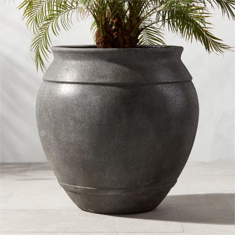 Making a massive statement in any sizable outdoor space, large-scale planter is composed of a material that resembles natural stone. Finished in a warm, textured charcoal, planter elevates the outdoors to dramatic effect. CB2 exclusive.