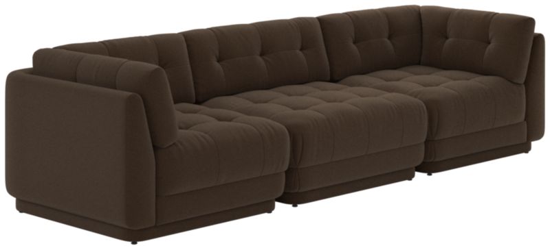 A modern reinterpretation of the midcentury low-slung sofa, velvet sectional by VUUE combines sculptural form with exceptional craftsmanship. Assembled by hand in North Carolina from wood certified by the Forest Stewardship Council ® (FSC), each piece features blind tufting, a tight seat cushion and a semi-attached back cushion for balanced comfort and structure. Its generous proportions and plinth base lend a grounded, architectural feel, while the deep, lounge-ready design invites relaxed living. Designed for flexible configurations including conversation pits, this is a modern classic in the making. CB2 exclusive.