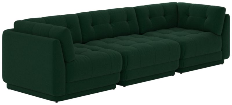 A modern reinterpretation of the midcentury low-slung sofa, velvet sectional by VUUE combines sculptural form with exceptional craftsmanship. Assembled by hand in North Carolina from wood certified by the Forest Stewardship Council ® (FSC), each piece features blind tufting, a tight seat cushion and a semi-attached back cushion for balanced comfort and structure. Its generous proportions and plinth base lend a grounded, architectural feel, while the deep, lounge-ready design invites relaxed living. Designed for flexible configurations including conversation pits, this is a modern classic in the making. CB2 exclusive.