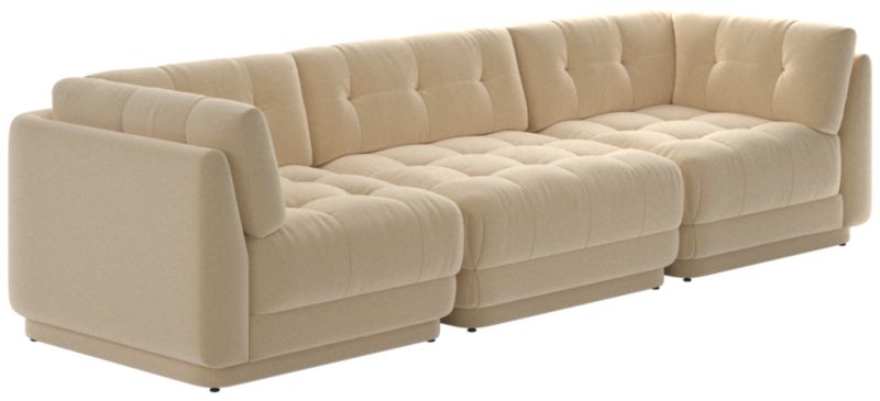 A modern reinterpretation of the midcentury low-slung sofa, velvet sectional by VUUE combines sculptural form with exceptional craftsmanship. Assembled by hand in North Carolina from wood certified by the Forest Stewardship Council ® (FSC), each piece features blind tufting, a tight seat cushion and a semi-attached back cushion for balanced comfort and structure. Its generous proportions and plinth base lend a grounded, architectural feel, while the deep, lounge-ready design invites relaxed living. Designed for flexible configurations including conversation pits, this is a modern classic in the making. CB2 exclusive.