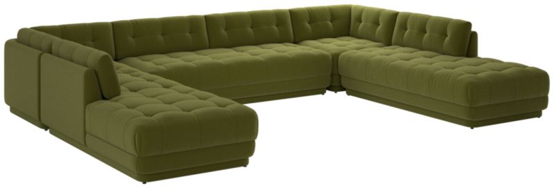 A modern reinterpretation of the midcentury low-slung sofa, velvet sectional by VUUE combines sculptural form with exceptional craftsmanship. Assembled by hand in North Carolina from wood certified by the Forest Stewardship Council ® (FSC), each piece features blind tufting, a tight seat cushion and a semi-attached back cushion for balanced comfort and structure. Its generous proportions and plinth base lend a grounded, architectural feel, while the deep, lounge-ready design invites relaxed living. Designed for flexible configurations including conversation pits, this is a modern classic in the making. CB2 exclusive.