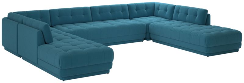 A modern reinterpretation of the midcentury low-slung sofa, velvet sectional by VUUE combines sculptural form with exceptional craftsmanship. Assembled by hand in North Carolina from wood certified by the Forest Stewardship Council ® (FSC), each piece features blind tufting, a tight seat cushion and a semi-attached back cushion for balanced comfort and structure. Its generous proportions and plinth base lend a grounded, architectural feel, while the deep, lounge-ready design invites relaxed living. Designed for flexible configurations including conversation pits, this is a modern classic in the making. CB2 exclusive.