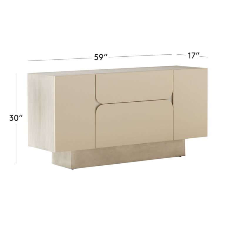 VUUE, enameled credenza on a cast aluminum base brings stunning yet simple storage to the dining room. Soft-close doors are enameled by hand, adding texture and dimension to the modern finish. Hand-poured and spread over the doors in a labor-intensive process, the enamel takes over six hours just to dry. Doors open to adjustable shelving with cord management for plenty of storage. CB2 exclusive.