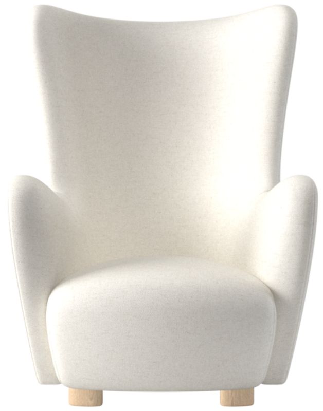 A modern take on a classic wing chair. Designer Ross Cassidy brings his signature flair to a popular silhouette by wrapping it entirely in luxe ivory boucle. Bleached oak feet are asymmetrical and wire-brushed for a special design detail, with matching asymmetrical ottoman sold separately. Framed out in FSC ®-certified wood. CB2 exclusive.