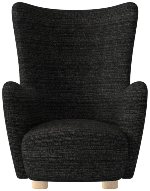 A modern take on a classic wing chair. Designer Ross Cassidy brings his signature flair to a popular silhouette by wrapping it entirely in luxe ivory boucle. Bleached oak feet are asymmetrical and wire-brushed for a special design detail, with matching asymmetrical ottoman sold separately. Framed out in FSC ®-certified wood. CB2 exclusive.
