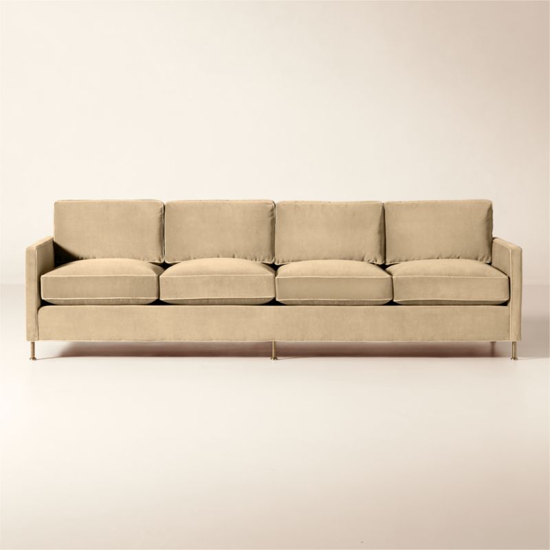 Assembled in North Carolina, velvet sofa by Los Angeles-based AD100 designer Ross Cassidy evokes the clean lines of early 20th-century French industrial design. The silhouette features a shelter back and plush cushions with a defining contrast welt trim. A modern classic, the sofa is covered in taupe velvet made by JB Martin, an award-winning South Carolina textile mill that has been family-run for six generations. CB2 exclusive.