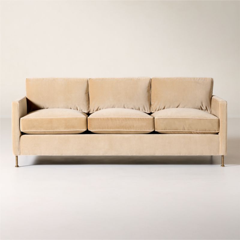 Ross Cassidy evokes the clean lines of early 20th-century French industrial design. The silhouette features a shelter back and plush cushions with a defining contrast welt trim. A modern classic, the sofa is covered in taupe velvet made by JB Martin, an award-winning South Carolina textile mill that has been family-run for six generations. CB2 exclusive.