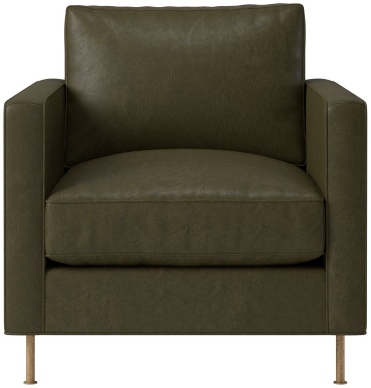 Assembled in North Carolina, leather chair by Los Angeles-based AD100 designer Ross Cassidy evokes the clean lines of early 20th-century French industrial design. The silhouette features a shelter back and plush cushions with a welt trim. CB2 exclusive.