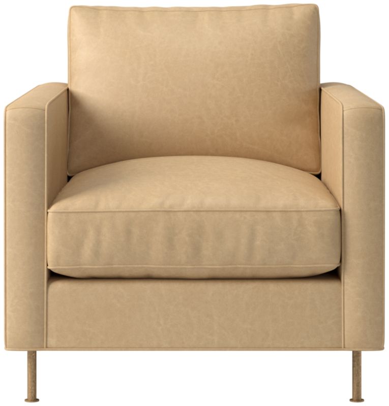 Assembled in North Carolina, leather chair by Los Angeles-based AD100 designer Ross Cassidy evokes the clean lines of early 20th-century French industrial design. The silhouette features a shelter back and plush cushions with a welt trim. CB2 exclusive.