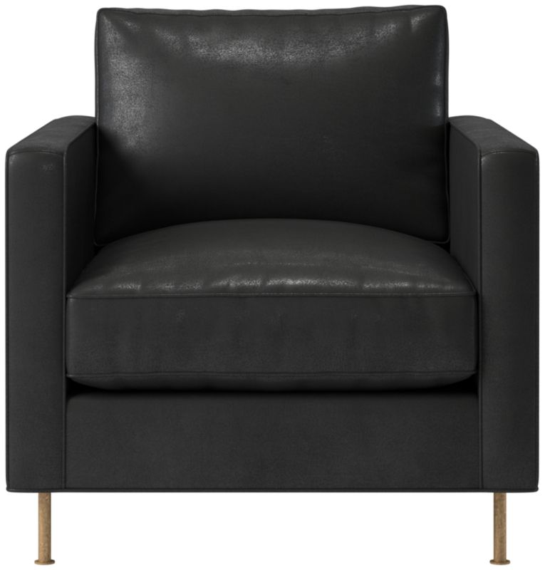 Assembled in North Carolina, leather chair by Los Angeles-based AD100 designer Ross Cassidy evokes the clean lines of early 20th-century French industrial design. The silhouette features a shelter back and plush cushions with a welt trim. CB2 exclusive.