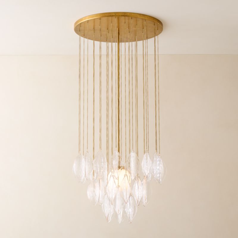 Capturing the spirit of vintage light fixtures, stunning chandelier by dach&zephir, an award-winning design studio based in Paris and Guadeloupe, glows through handcrafted textured glass leaves. Inspired by "karambole" (also known as star fruit) that grow in Guadeloupe, the pointed cast glass leaves cascade like a waterfall of light on aged brass chains. A matte opal glass globe shade at its heart offers a soft, warm glow. CB2 exclusive.