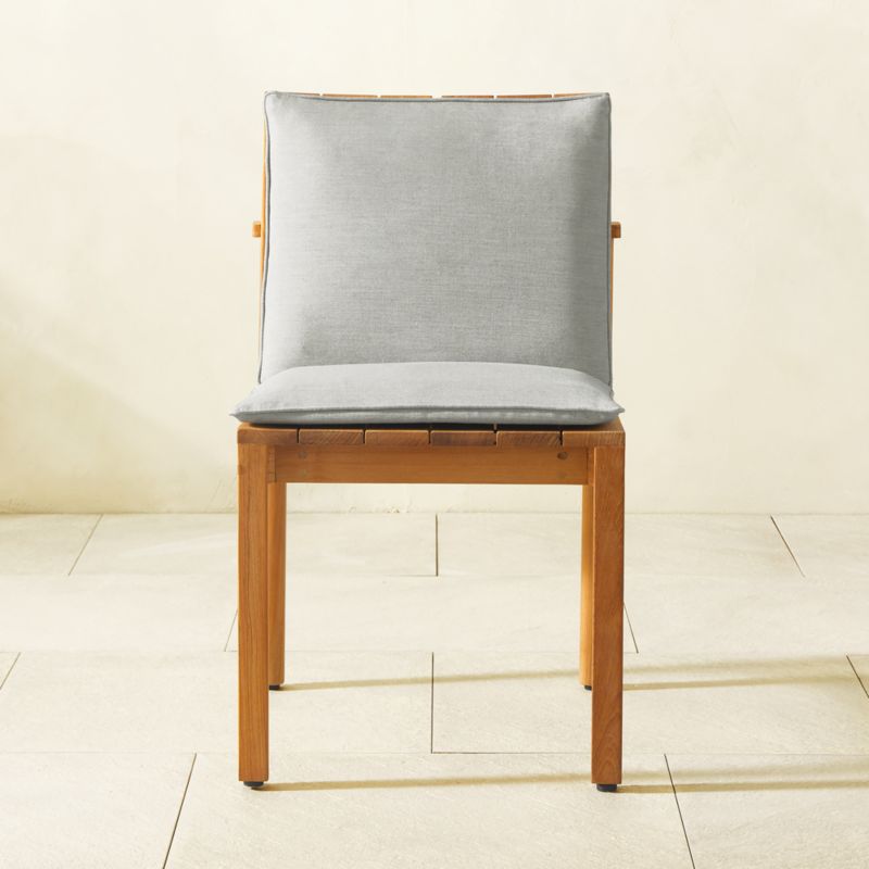Jannis Ellenberger brings a minimalist sensibility to the outdoor living space. Dining chair's wooden planks — made of premium Grade A teak, the highest-quality teak available — curve slightly for support and sit atop thick, solid bullnose legs to create a timeless silhouette. Removable, solution-dyed grey Sunbrella® cushions are colorfast, easy to clean and UV-resistant. Certified sustainable by the Forest Stewardship Council® (FSC), teak frame will weather to a silvery grey patina if left unprotected over time. Maintain its natural beauty with outdoor furniture cleaner, teak oil and a protective cover (sold separately). Coordinates impeccably with Cabra dining table, sun lounger and sectional. CB2 exclusive.