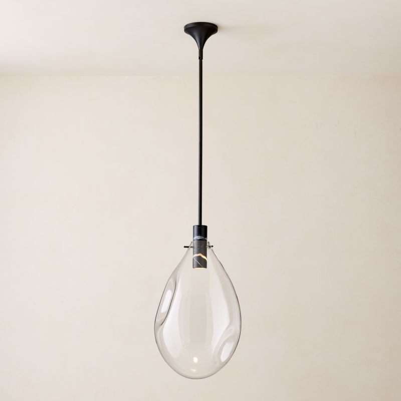 Farrah Sit, pendant light gleams overhead with an elegant mixed-material look. Encased by a blown-glass shade, the pendant is suspended from a slim, polished blackened brass rod, giving the appearance that the fixture is floating from the ceiling. Housed within Marquina black marble, the bulb emits a warm glow that highlights the beauty of the stone. CB2 exclusive.