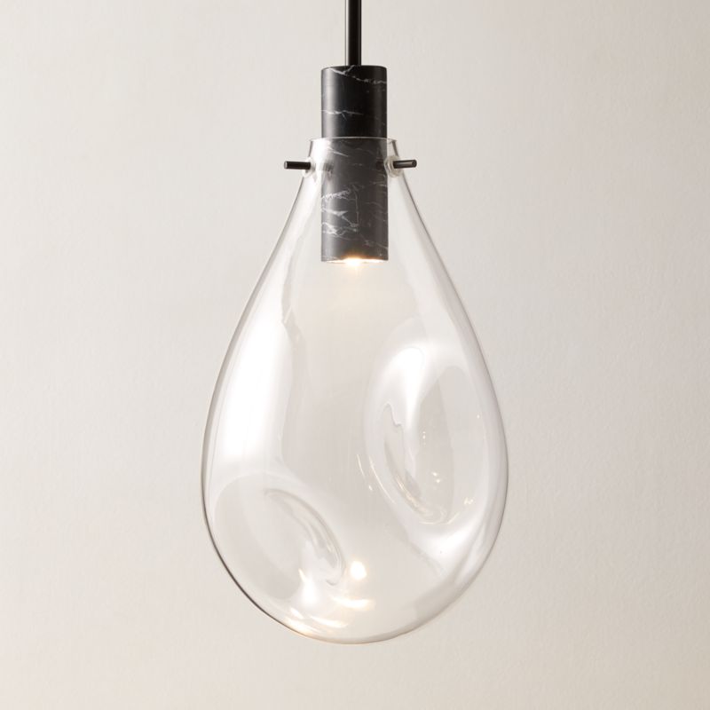 Farrah Sit, pendant light gleams overhead with an elegant mixed-material look. Encased by a blown-glass shade, the pendant is suspended from a slim, polished blackened brass rod, giving the appearance that the fixture is floating from the ceiling. Housed within Marquina black marble, the bulb emits a warm glow that highlights the beauty of the stone. CB2 exclusive.