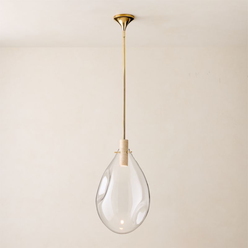 Designed by Farrah Sit, pendant light gleams overhead with an elegant mixed-material look. Encased by a blown-glass shade, the pendant is suspended from a slim, polished brass rod, giving the appearance that the fixture is floating from the ceiling. Housed within unfilled travertine, the bulb emits a warm glow through the stone's natural pitting. Brass is unlacquered, offering a living finish that will develop the patina of a vintage find. CB2 exclusive.