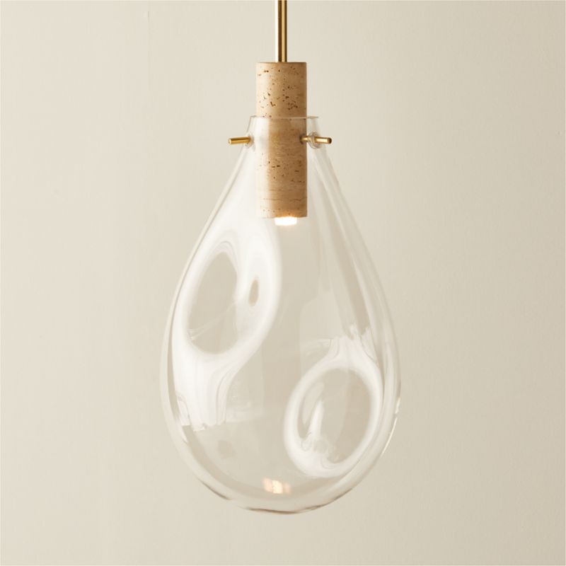 Designed by Farrah Sit, pendant light gleams overhead with an elegant mixed-material look. Encased by a blown-glass shade, the pendant is suspended from a slim, polished brass rod, giving the appearance that the fixture is floating from the ceiling. Housed within unfilled travertine, the bulb emits a warm glow through the stone's natural pitting. Brass is unlacquered, offering a living finish that will develop the patina of a vintage find. CB2 exclusive.