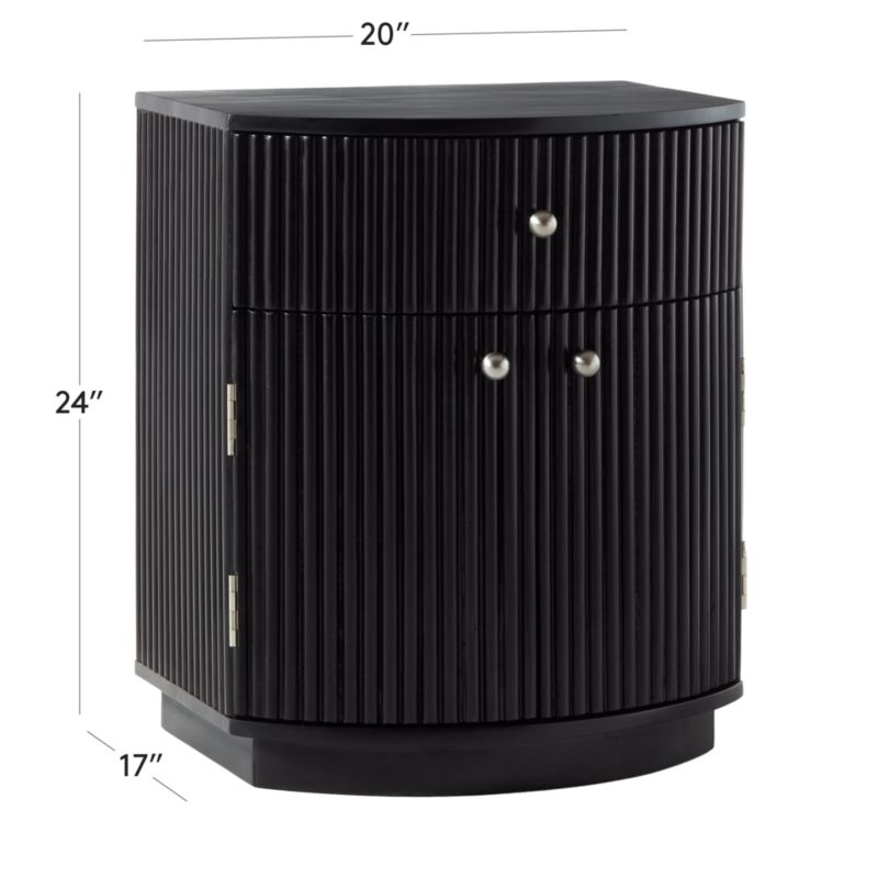Black-stained mango wood nightstand supports a unique, curved silhouette and configuration: one drawer and two doors concealing a shelf inside for extra storage. We love the on-trend channeled detailing and satin-finish stainless steel knobs, too. CB2 exclusive.