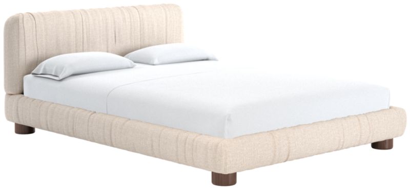 Fully upholstered bed by Jannis Ellenberger brings luxury and drama to the bedroom. Padded headboard, footboard and rails are enveloped in ruched fabric; stout cylindrical legs, crafted of oak certified sustainable by the Forest Stewardship Council® (FSC), keep the look modern. CB2 exclusive.