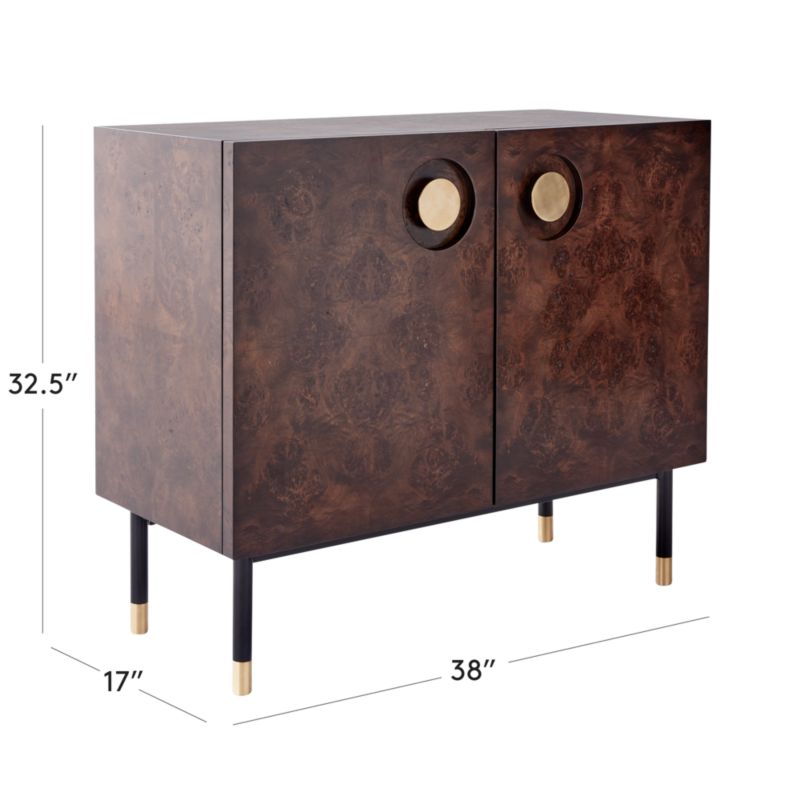 Mermelada Estudio is informed by classic art deco design with its rich burl wood veneer, precisely diamond-matched for symmetry and a pleasing aesthetic. Satin black legs are capped with brass to match the circular brass pulls. Brass is unlacquered, offering a living finish with the patina of a vintage find. CB2 exclusive.
