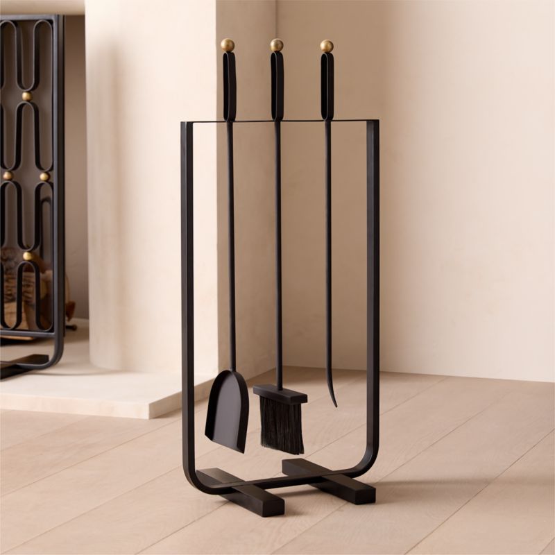 Art deco-inspired fireplace tools by Studio ANANSI sport soft curves and antiqued brass details, adding modern edge through strong angular details and graphic form. Sleek matte black iron rack holds brush, poker and shovel, while heat-resistant finishes help protect the tools' beauty for years to come. CB2 exclusive.