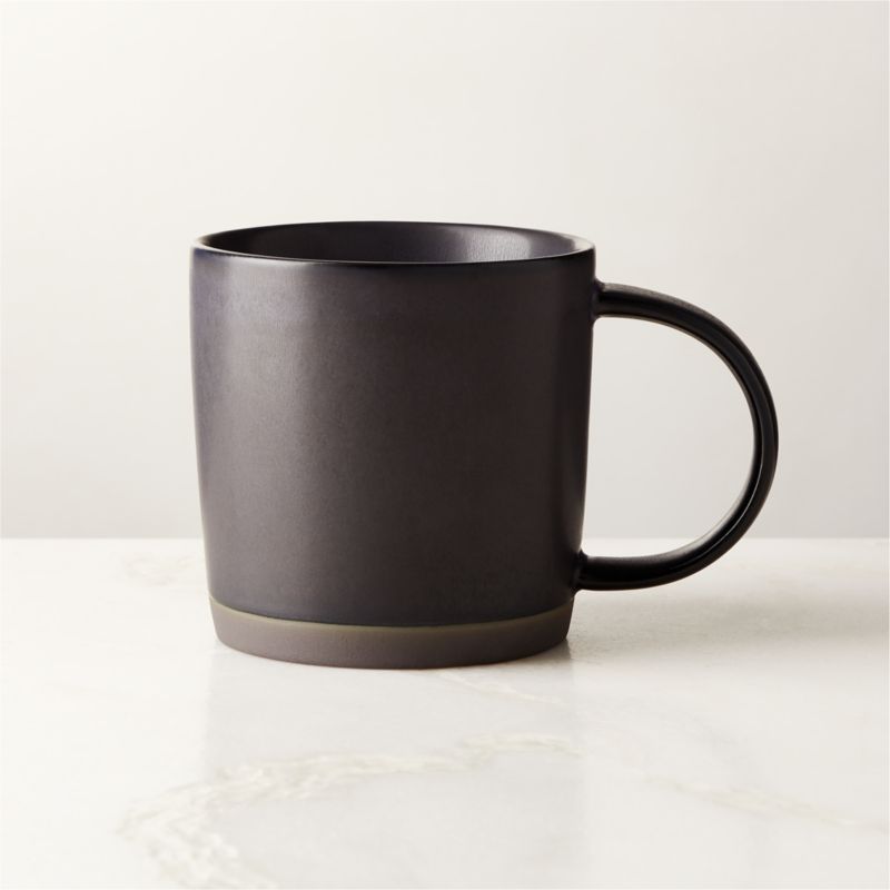 Natural stoneware forms round mug with thin, half-circle handle. Before it's fired, mug is hand-dipped into matte black reactive glaze from top to almost-bottom, leaving a single band of natural grey stoneware at the base. Each will be unique with variation in color and glaze height. CB2 exclusive.