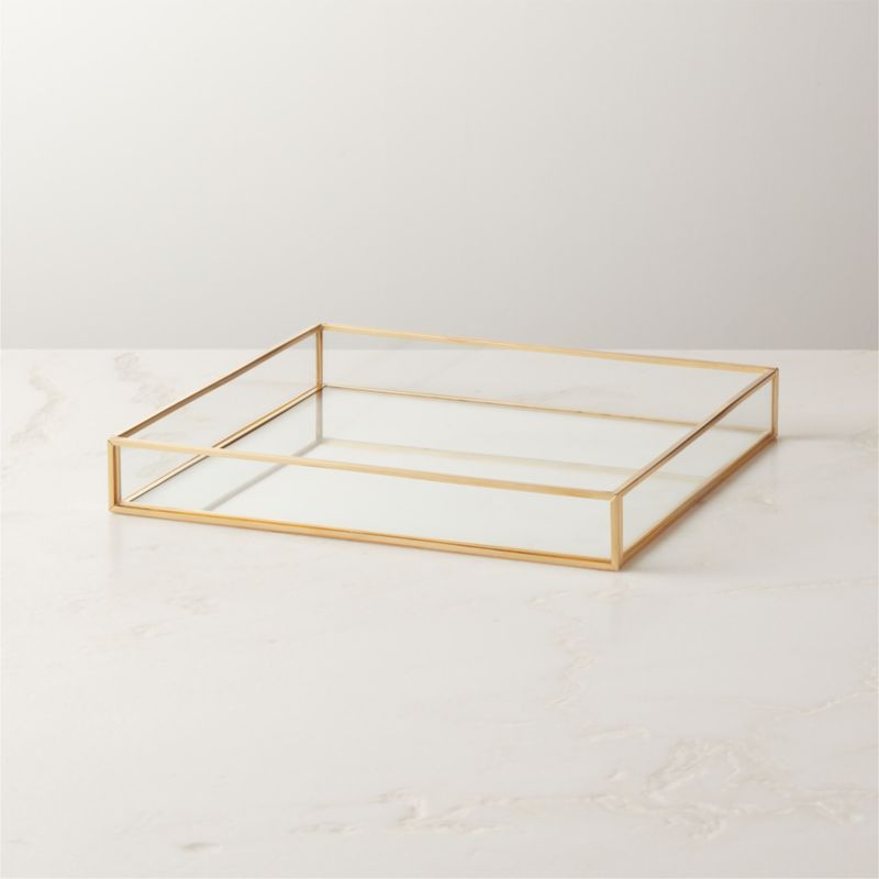 Rectangular vanity tray is crafted from tempered glass. Contrasting brushed brass trim provides warmth. Coordinate with the Elton brushed brass bath collection for an elevated look. CB2 exclusive.