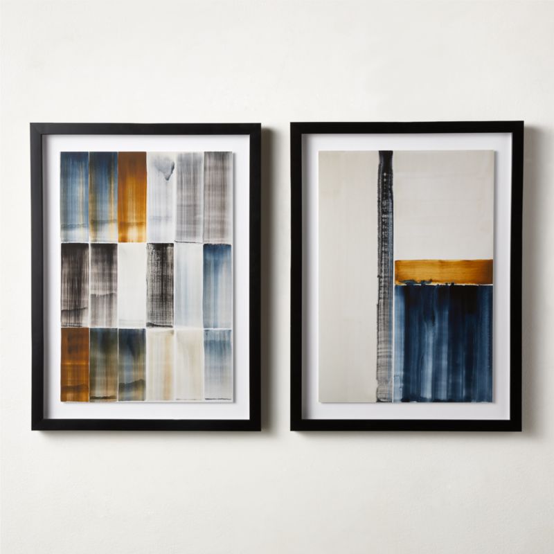 "There is something really beautiful about the simplicity of well-proportioned columns and the visual cadence you can create with just a few elements," says artist Sarah Von Dreele. That philosophy is evident in the gridlike composition of her "Cery" diptych, whose brushstrokes bring forth varying levels of transparency in ochre, black and marine-blue hues. Presented in a pine frame with a black finish, these giclée prints on premium paper are reproduced based on Von Dreele's gouache technique.