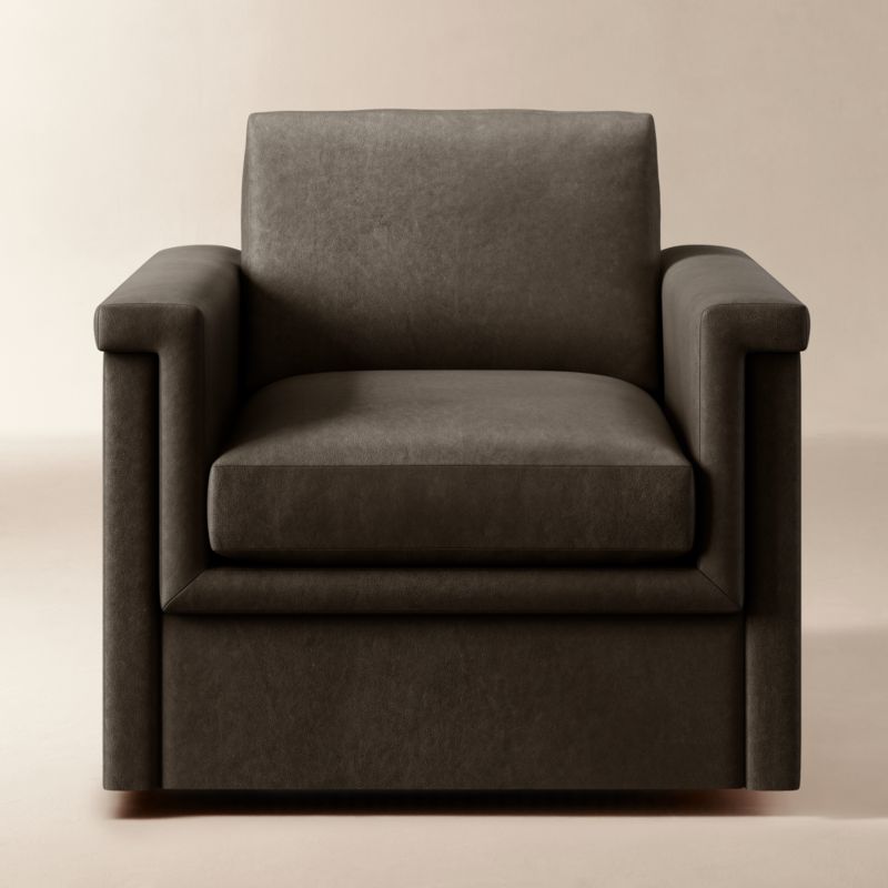 VUUE brings sculptural presence to any room. Upholstered in soft yet resilient leather, it rests on a concealed 360-degree swivel base for smooth, effortless movement. The durable kiln-dried hardwood frame is hand-assembled in North Carolina from FSC®-certified wood. Plush feather and down cushions ensure long-lasting comfort while softening the design's strong lines. CB2 exclusive.