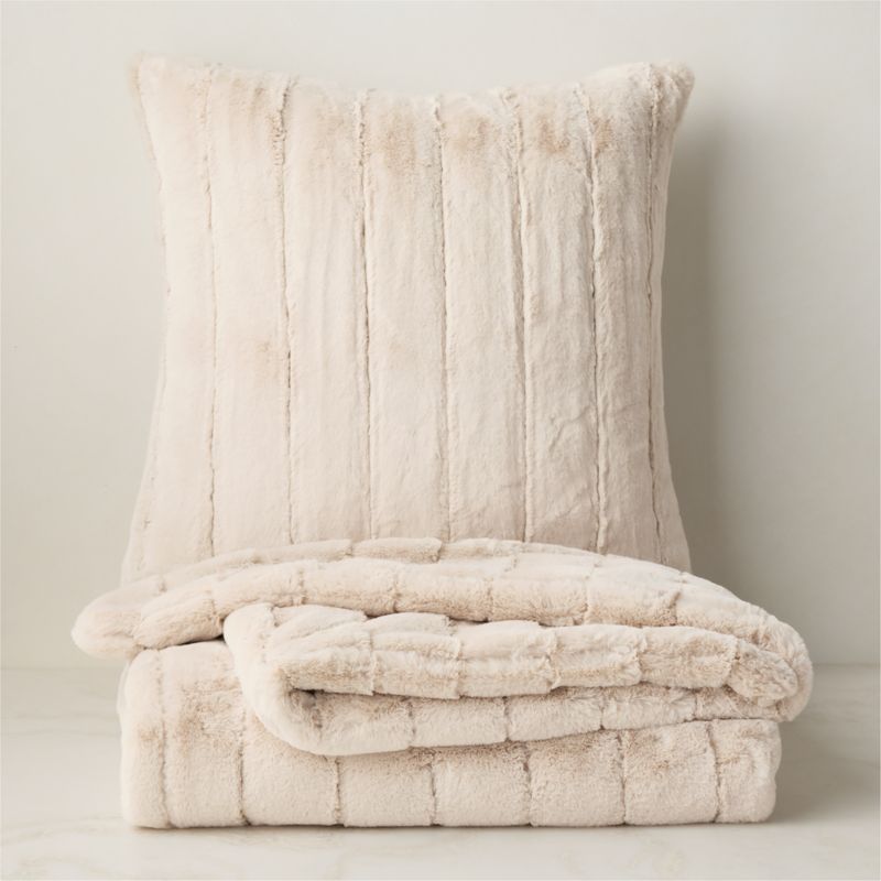 Premium faux fur throw blanket and matching throw pillow cover are irresistibly soft. Woven of sumptuous yarns with a sleek channel detail, the pillow cover and blanket recreate the warmth and silky feel of genuine fur. CB2 exclusive.