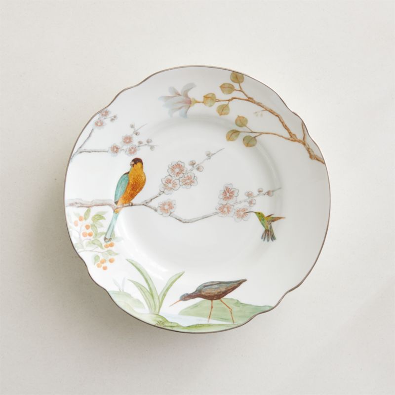 Hand-applied chinoiserie decal and shiny silver rim lend a whimsical touch to fine bone china salad plate. "We worked really hard to get the delicate profile just right – you get that wedding-china quality without the hefty price tag, or the guilt of using them everyday," says goop of their dinnerware collection. The pattern of birds and butterflies was inspired by a French take on traditional Chinese motifs. Adds an elegant yet eclectic vibe to everyday meals and special occasions alike. CB2 exclusive.