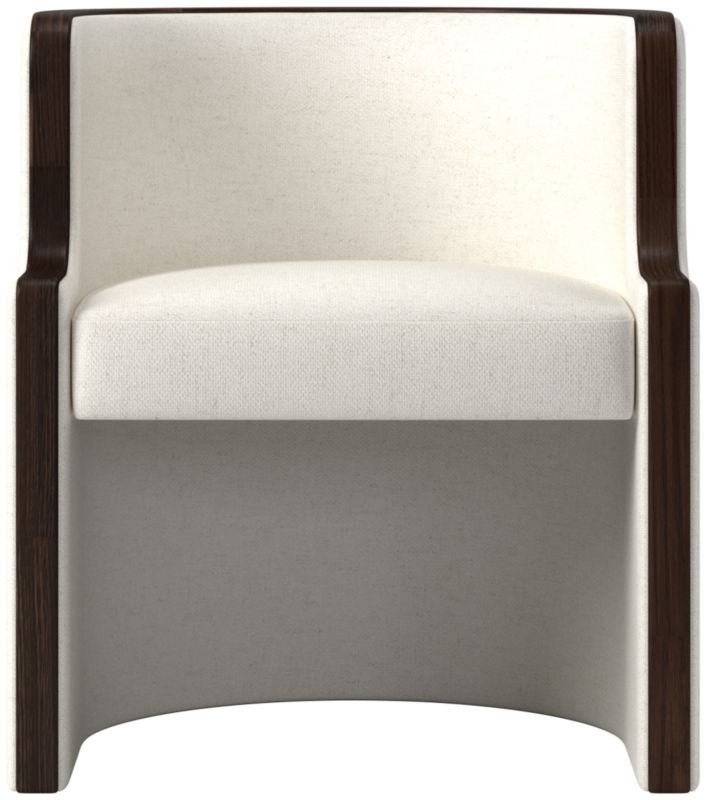 Classic-meets-contemporary barrel chair by Brett Beldock is wrapped in fabric and outlined by a thick band of solid American red oak certified sustainable by the Forest Stewardship Council®. Makes a bold statement as an end chair or can be used as a side chair. CB2 exclusive.