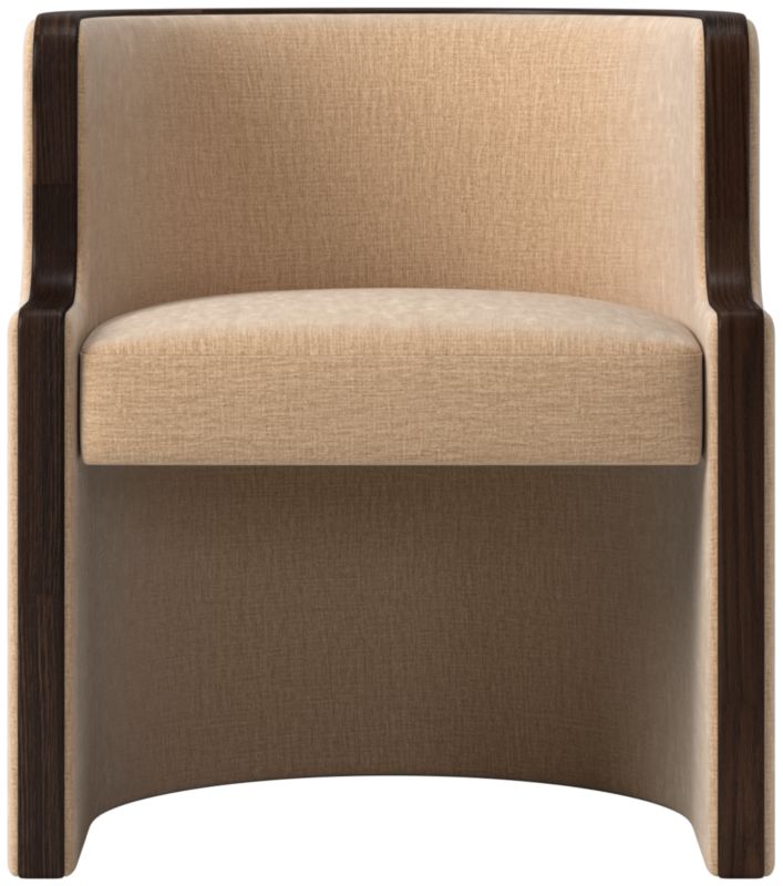 Classic-meets-contemporary barrel chair by Brett Beldock is wrapped in fabric and outlined by a thick band of solid American red oak certified sustainable by the Forest Stewardship Council®. Makes a bold statement as an end chair or can be used as a side chair. CB2 exclusive.